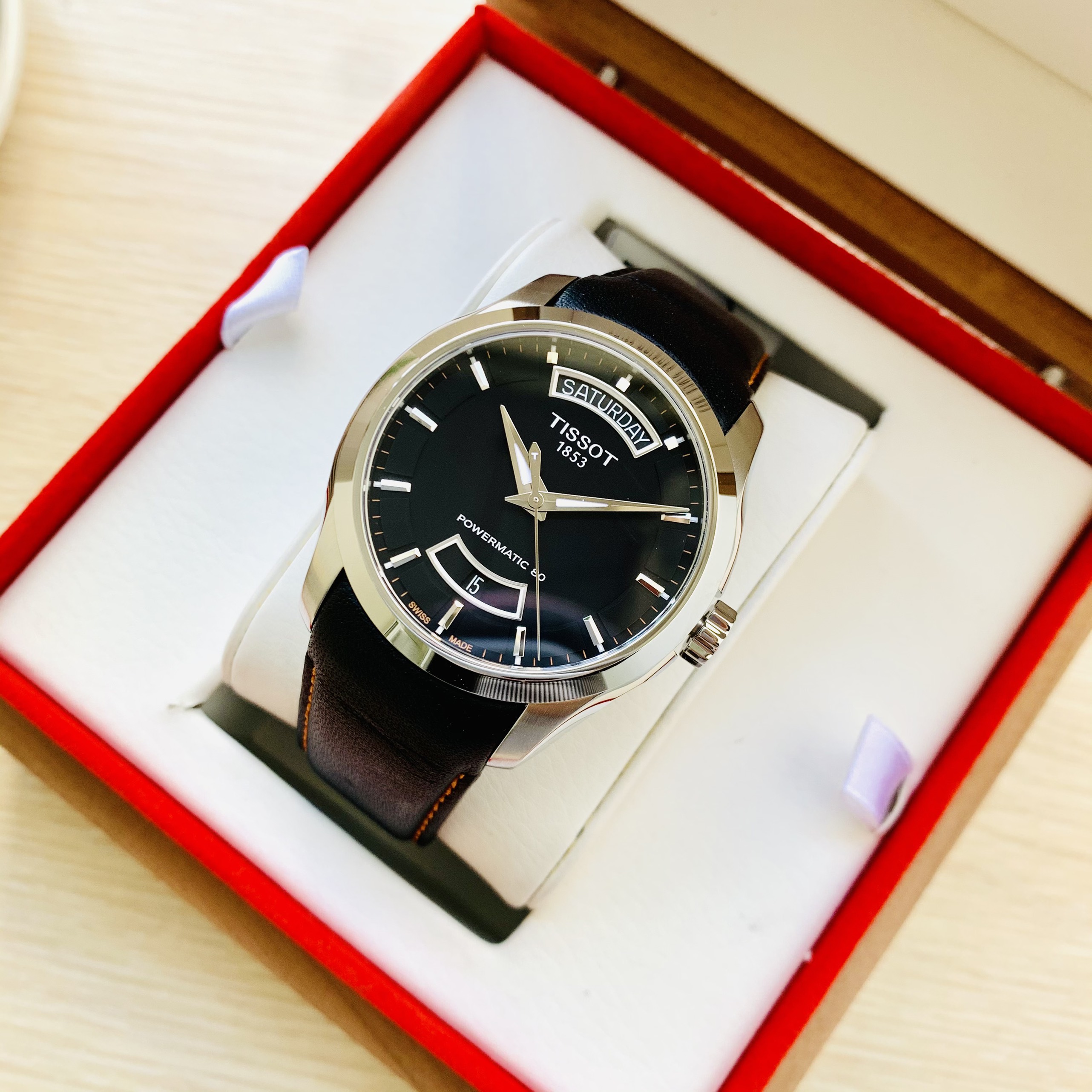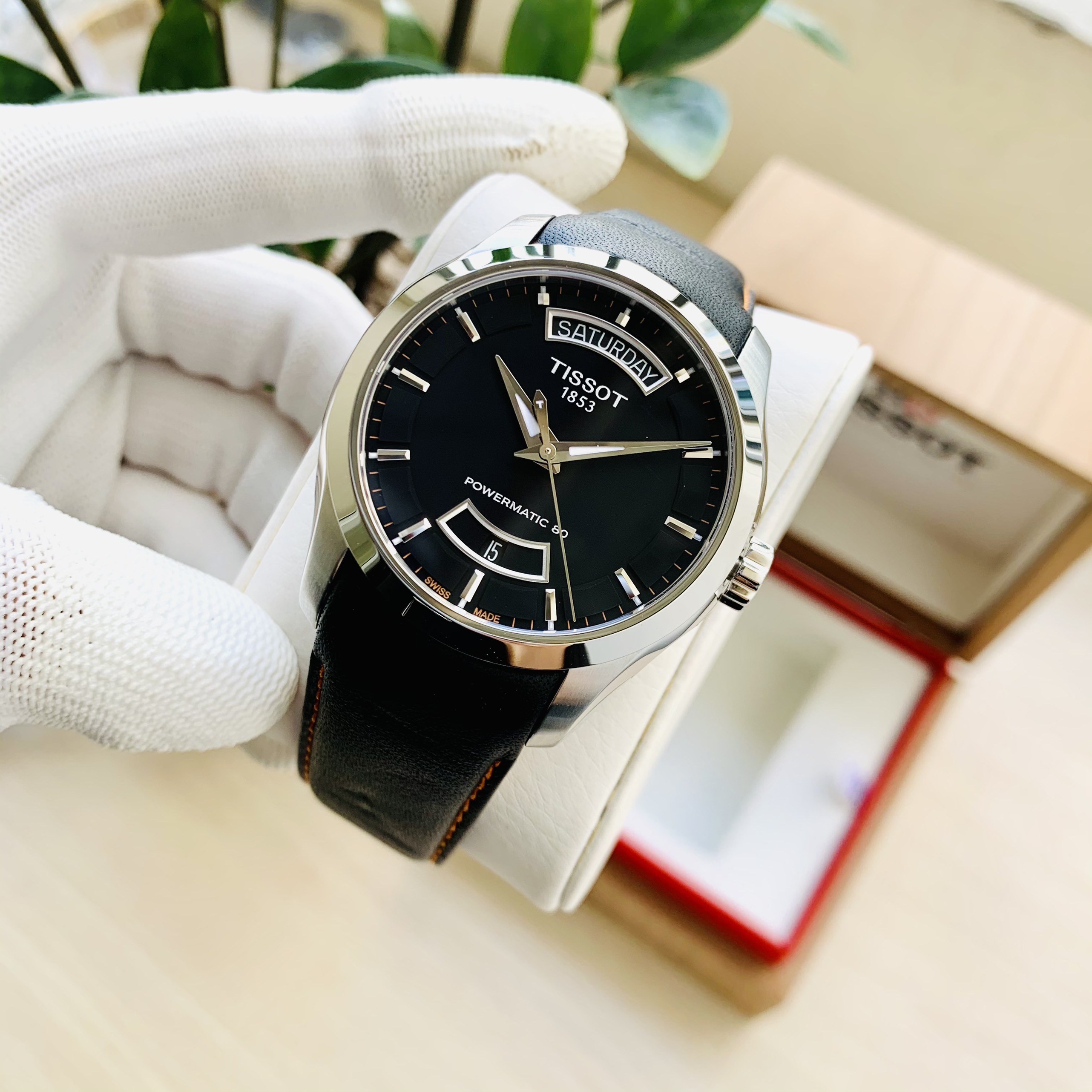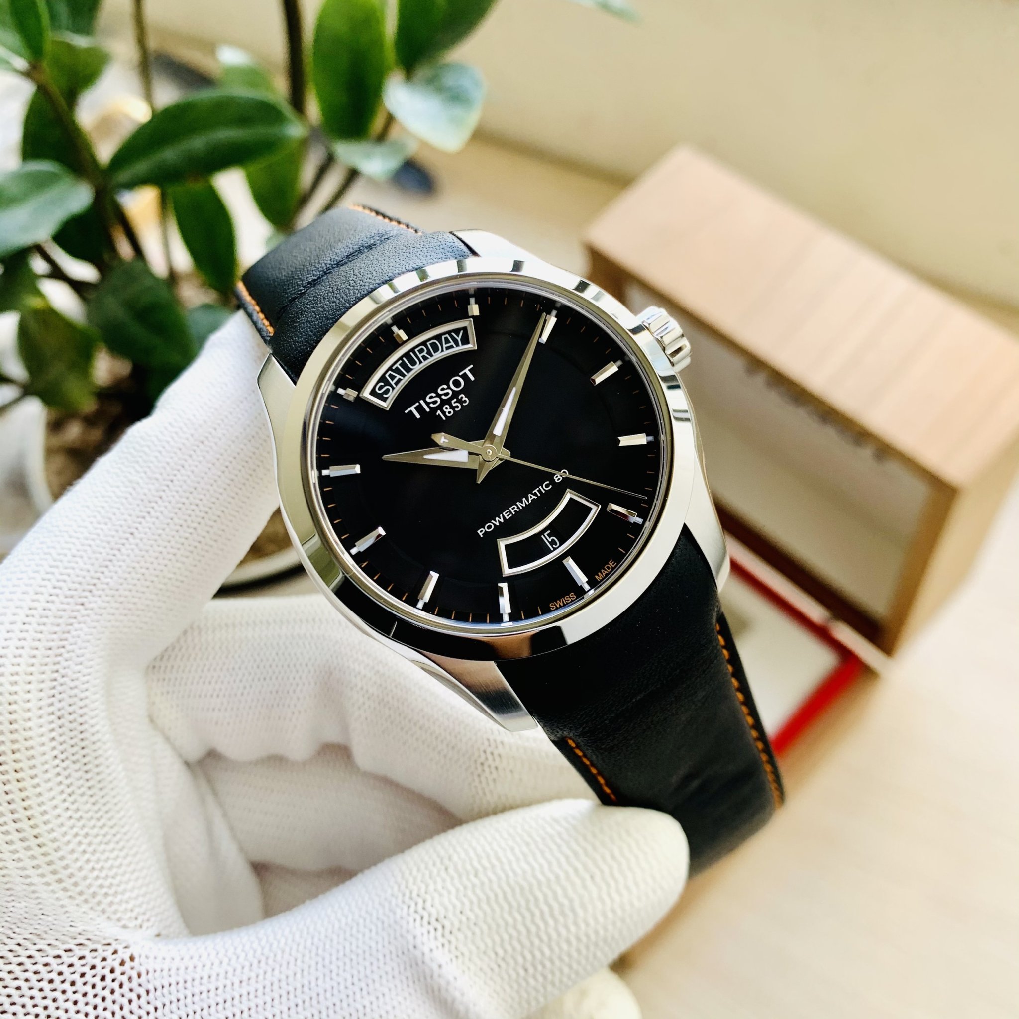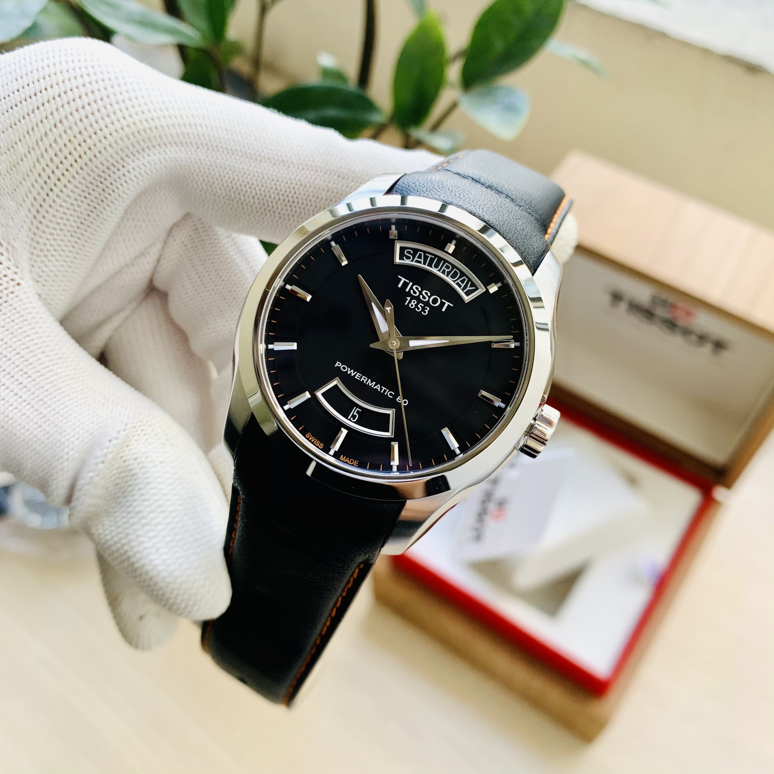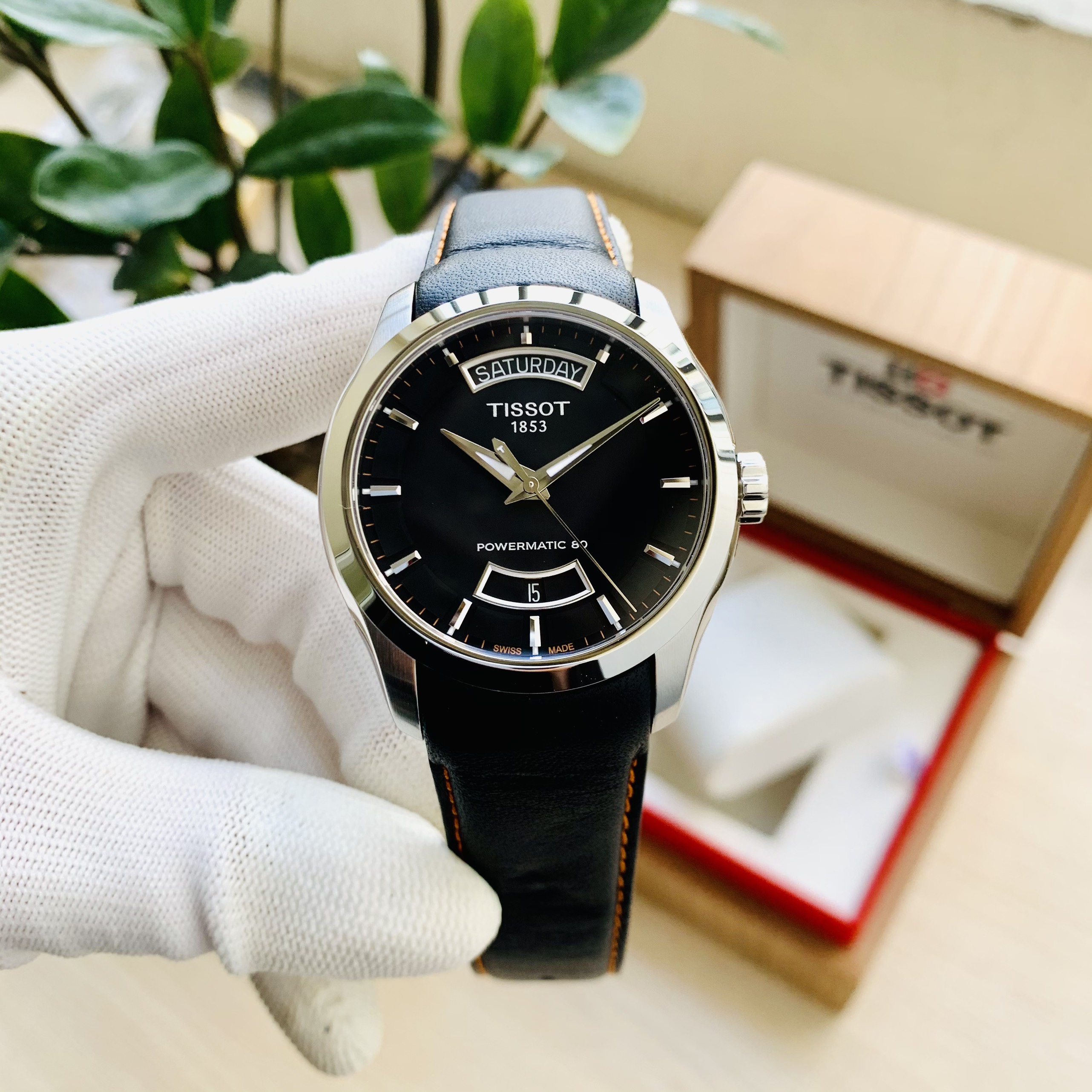 Đồng hồ TISSOT COUTURIER POWERMATIC 80 T035.407.16.051.03 (Mặt đen, vỏ trắng, dây da đen chỉ cam)