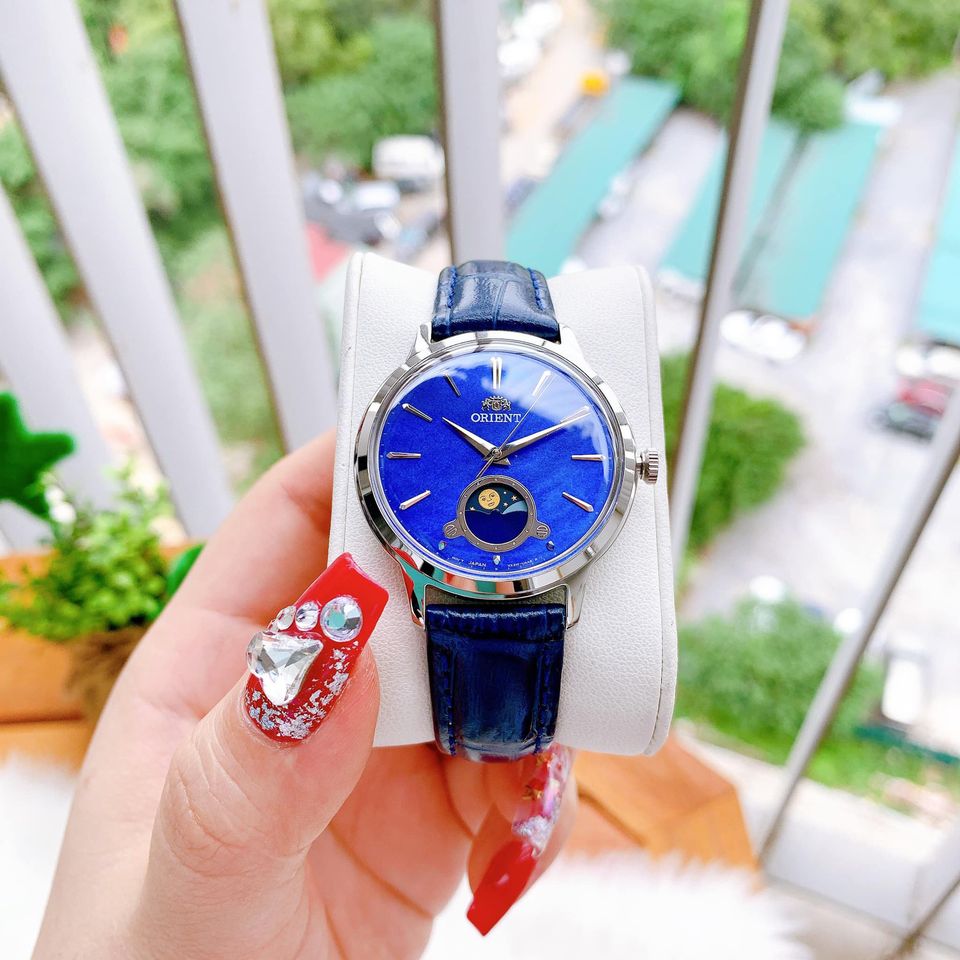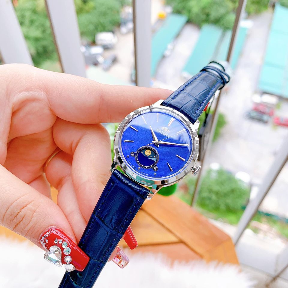 Dây da xanh, khoá cài, dây tiệp màu dial cùng mặt sunmoon tuyệt đẹp chuyển động theo giờ chạy đồng hồ
