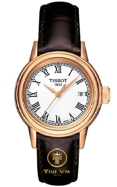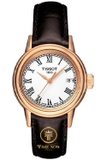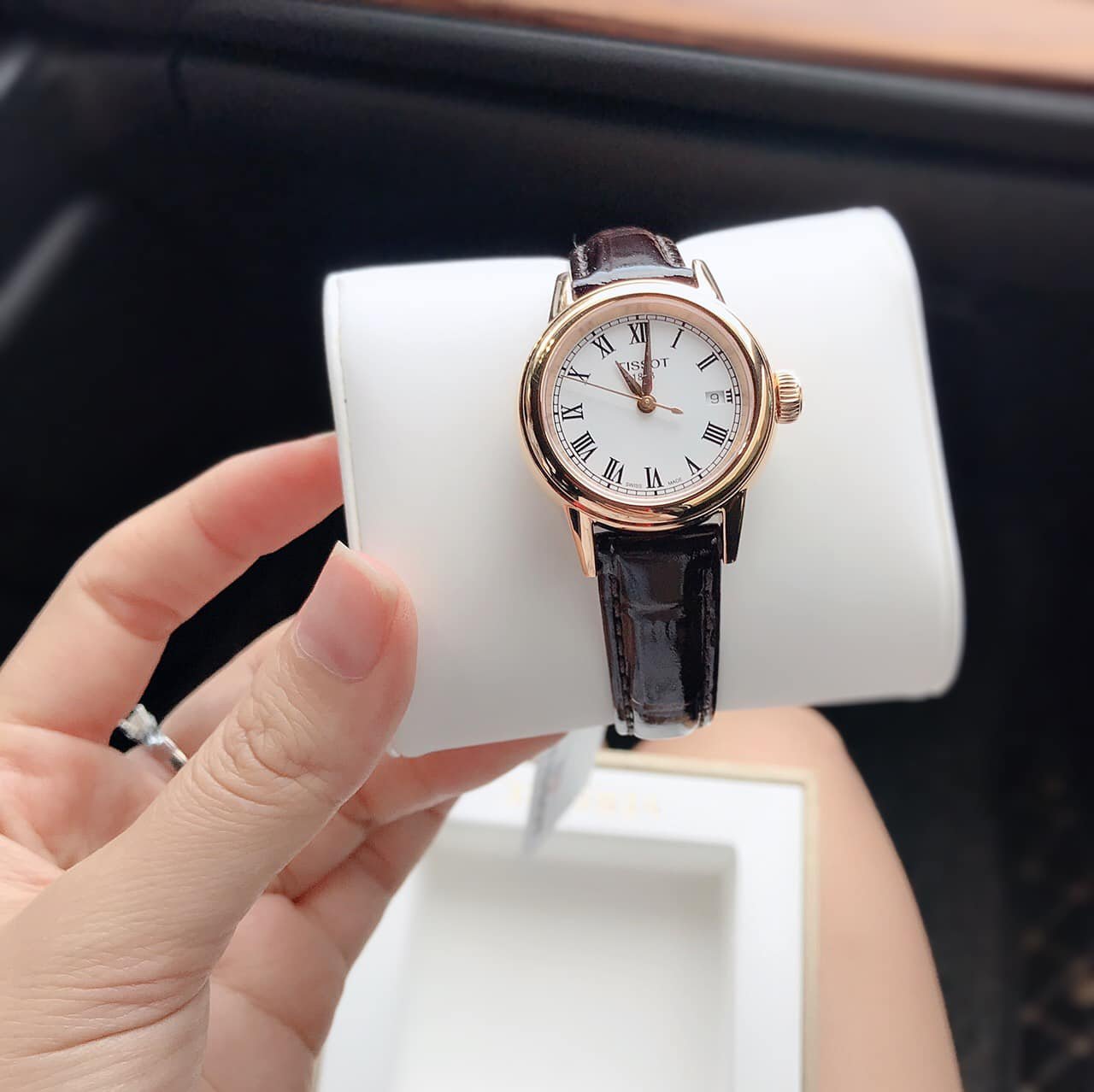 Đồng hồ Tissot T085.210.36.013.00 có mặt số tròn nhỏ với vỏ kim loại màu đồng, kim chỉ thanh mãnh và vạch số La Mã phủ màu đen nổi bật trên nền số màu trắng trang nhã, dây đeo bằng chất liệu da màu nâu bóng đem lại phong cách sang trọng quyến rũ cho phái nữ.
