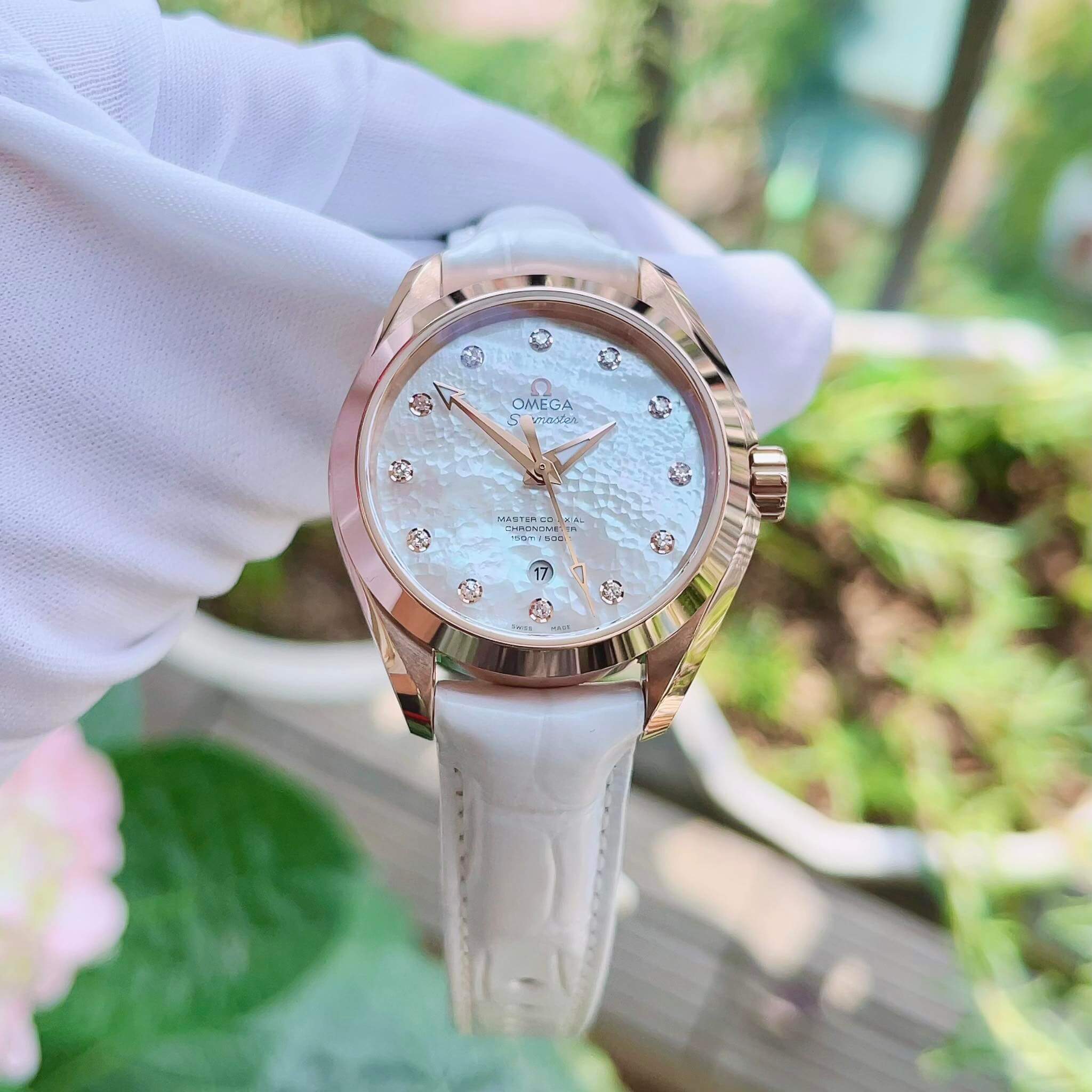Omega Seamaster Aqua Terra 150M Master Co-Axial Chronometer với Dial ngọc trai cực quyến rũ và cọc số là 12 viên kim cương
